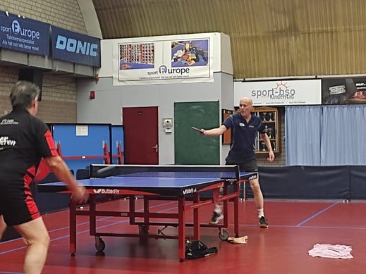 We wisten vooraf dat het wel eens een hete avond kon worden. Dus met 3 sterren in topvorm aan de slag. Mark had het een beetje hoog in zijn bol na de 100% van vorige keer, en moest nu meteen buigen tegen Melvin, wel met het kleinste verschil en uiteraard 5 sets. Zoltan mocht tegen Robert starten en wist met solide spel en vast beradenheid de 5 setter binnen te slepen. René startte tegen Jeroen super, maar Jeroen had aan het eind van 5 sets René op de knieën. De dubbel waarin Zoltan en René na een 2-0 in sets zeer sterk terug kwamen was een heerlijke pot. Tussenstand dus 2-2. Alles in 5-sets en bijna 2 uur gespeeld. Dit kan niet dacht Mark en was vervolgens kansloos tegen Robert en Jeroen. Zo die staat weer met beide voeten in de klei 😊. Voor René was Melvin ook een tandje te vast, maar hij versloeg erg knap Robert in (uiteraard) 5 sets, met volhardend en geconcentreerd spel. De tussenstand 5-4 voor Oss was een juiste verhouding. Mark was niet best en René deed zijn best 😊. Zoltan was echter on fire deze avond en speelde buitengewoon. Hij had er natuurlijk al 2 gewonnen en de dubbel samen met René. Zoltan had namelijk geen kind aan Jeroen, die hij in 3 sets versloeg. De laatste pot tegen Melvin werd echter de pot van de avond. Een ware uitputtingsslag, met geweldige rally’s van beide kanten. De volle kantine (6 mensen om 00.30 uur op woensdagavond) genoot met volle teugen. Helaas moest Zoltan buigen voor een fantastische Melvin.